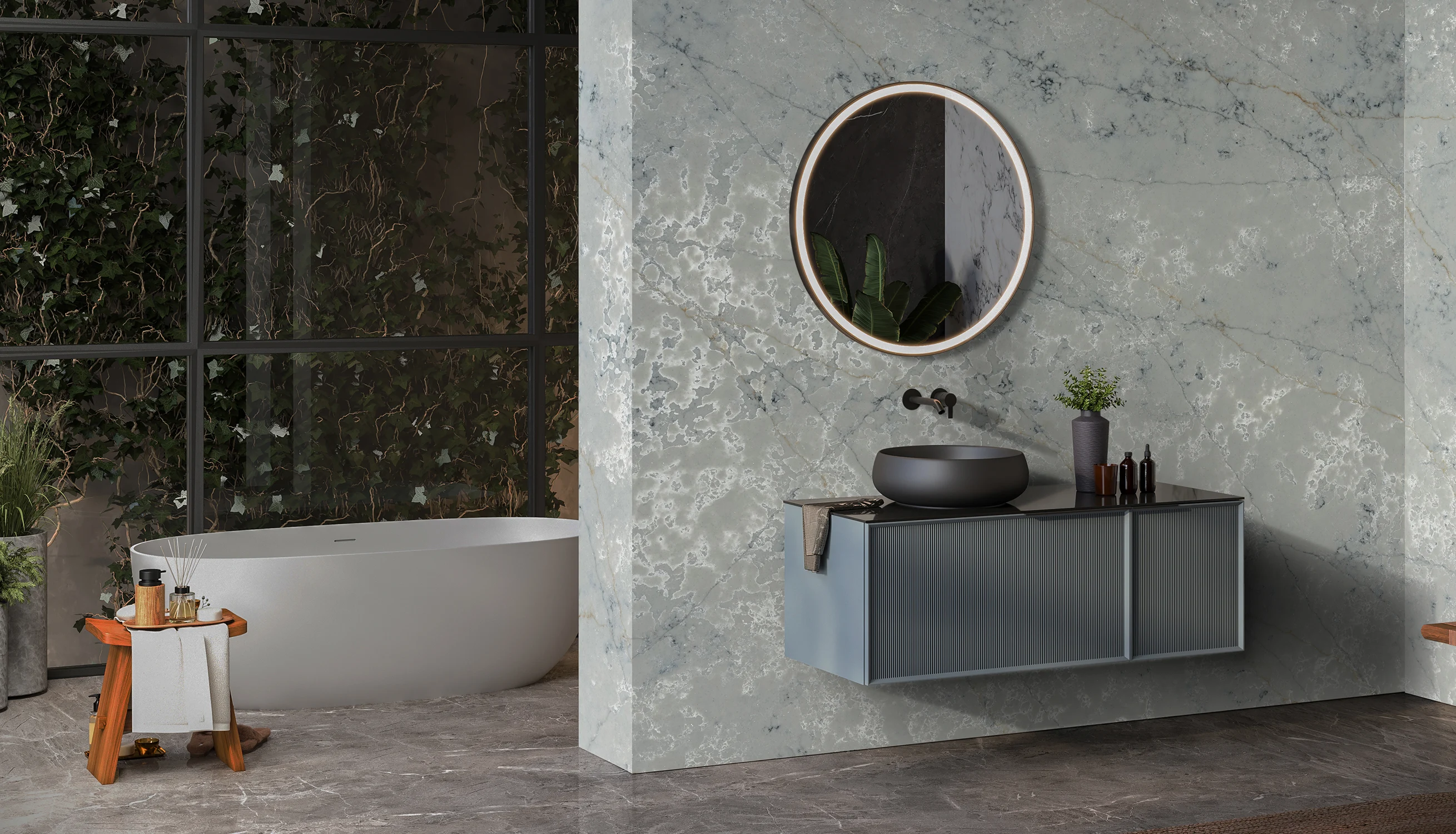 A luminous grey surface with continuous, feathered veining that appears seamless in its flow. The aesthetic is expansive, calm, and timelessly elegant.