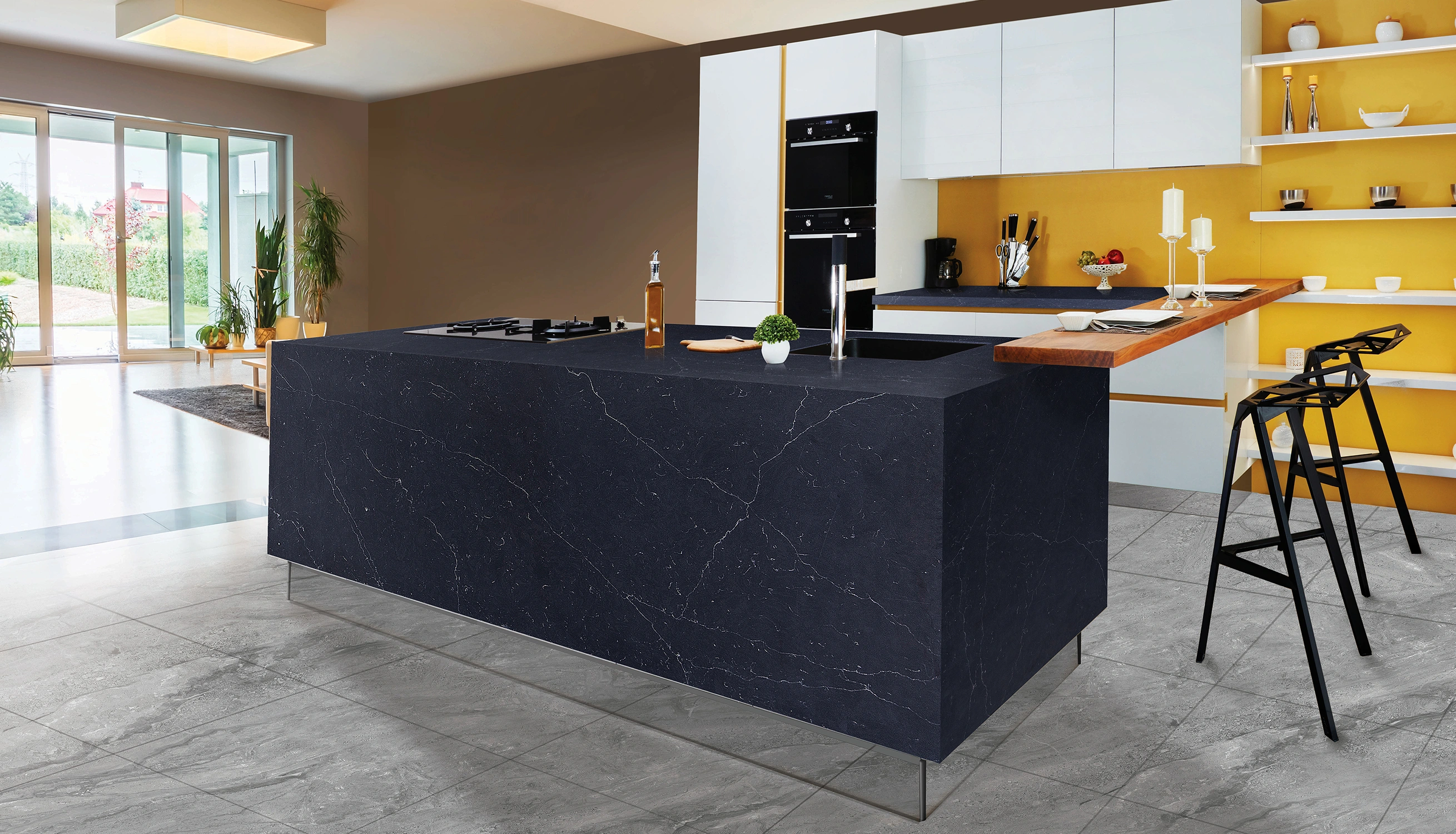 A charchoal surface accented with refined white veining that flows in structured, marble-inspired formations. The aesthetic is architectural and poised.
